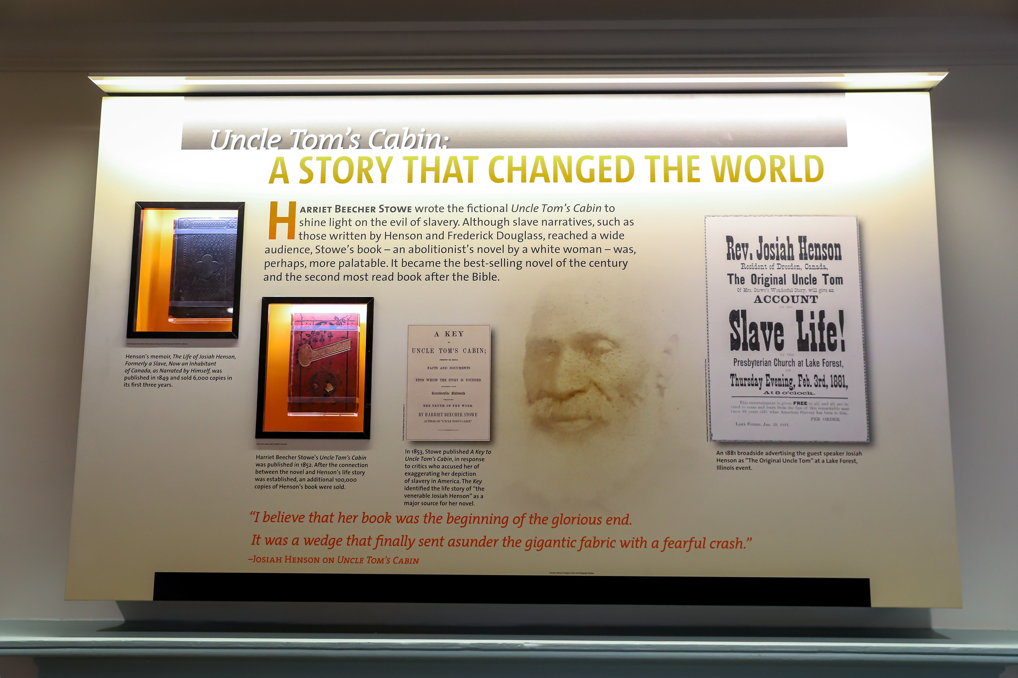 In 1830, Henson escaped with his wife and children to Canada. Henson’s became an influential author, abolitionist, and public speaker. He helped establish Dawn Settlement, a community inhabited by former American slaves and he repeatedly returned to the United States to guide 118 others to freedom as a conductor on the Underground Railroad. Henson’s 1849 autobiography, The Life of Josiah Henson, Formerly a Slave, Now an Inhabitant of Canada inspired Harriet Beecher Stowe’s landmark anti-slavery novel, Uncle Tom’s Cabin. Stowe’s novel broke all sales records of the time, and many believe the novel helped to propel the Civil War.